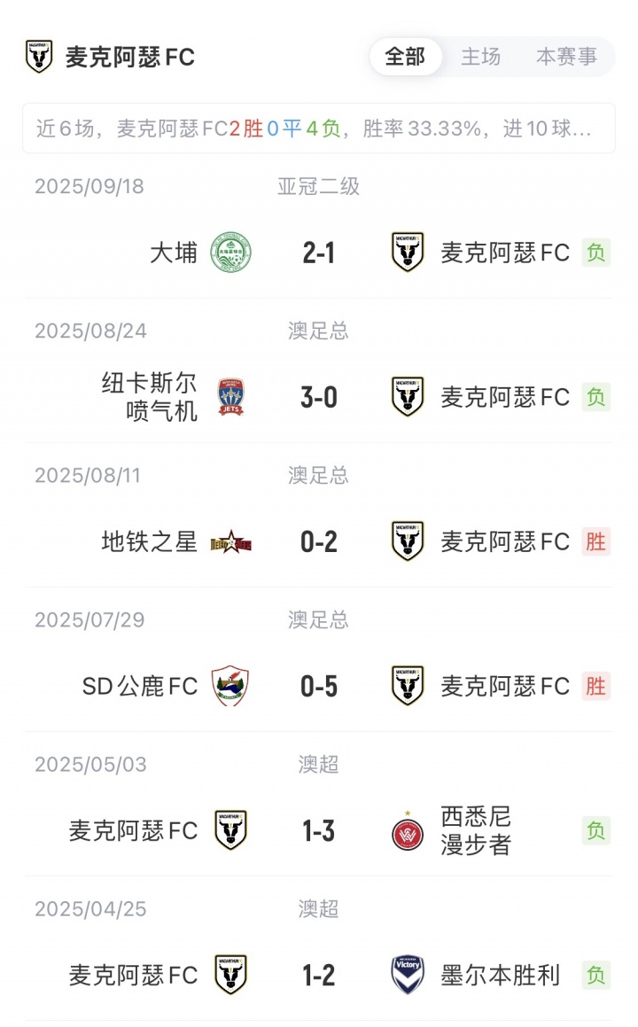 国安与麦克阿瑟此前还未交手过,两边近6场比赛战绩如下: