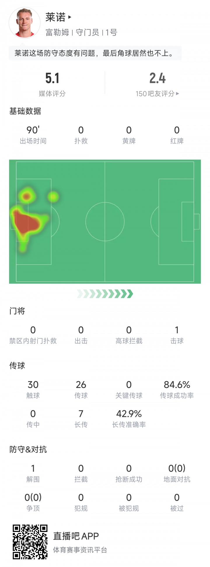 反不雅富勒姆门将莱诺,曼城4次射正,他丢了5球,评分也很低,愈加无奈。