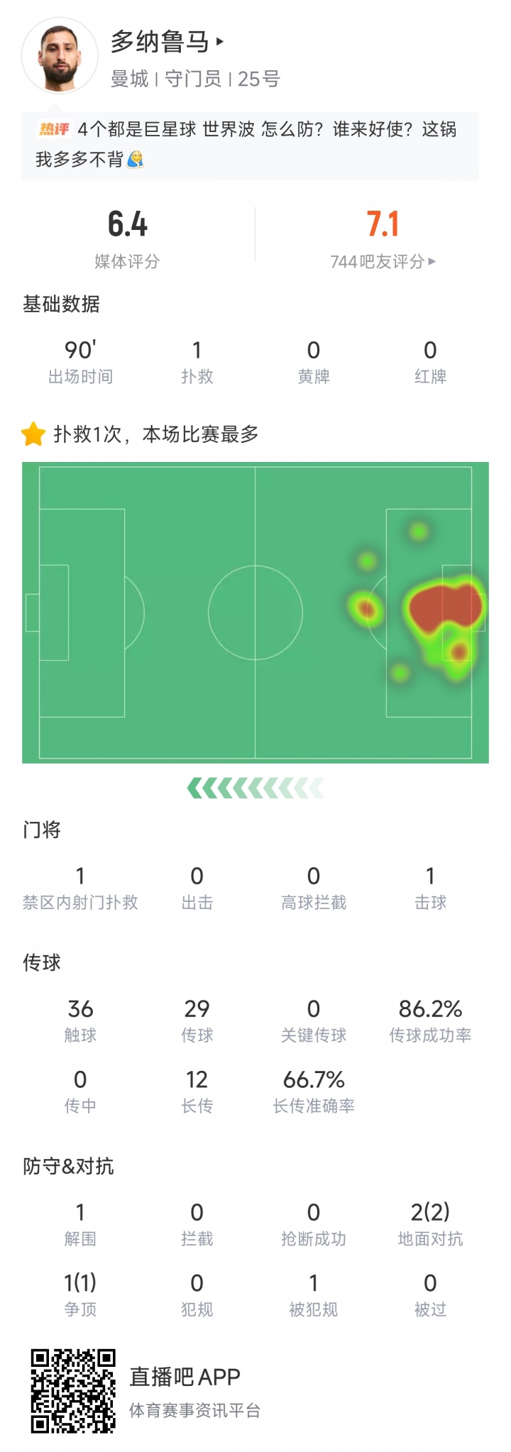 你扑你也麻……曼城一战狂丢4球多纳鲁马仅1扑救,全是爆射至人球