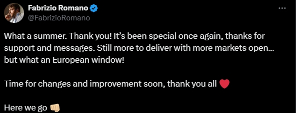 冬窗再会!夏窗负责关窗,罗马诺感谢球迷:记起的夏天,谢谢全球