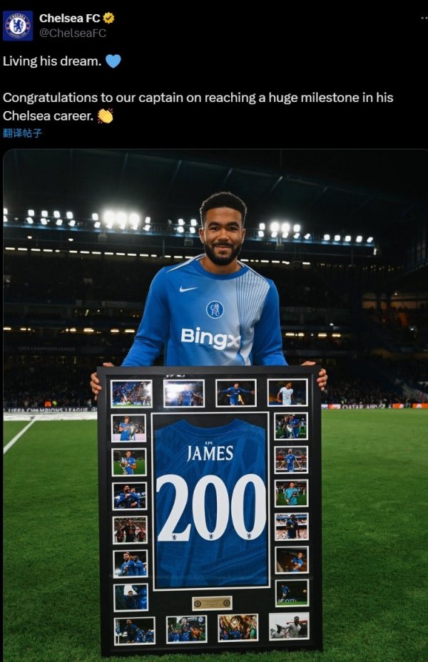10月23日讯 切尔西在本轮欧冠主场迎战阿贾克斯,队长詹姆斯在赛前获赠200场里程碑牵挂品。 里斯-詹姆斯在本场比赛达成切尔西生活200场里程碑,他在赛前也展示了俱乐部为其支撑的牵挂相框,主体为印有200字样的他本东说念主的球衣,邻近则是包括捧得世俱杯和欧冠在内的高光时辰。 切尔西官推也对此示意:“已毕着他的梦念念。💙祝愿咱们的队长达成了在切尔西行状生活的进军里程碑。 👏”......查看更多