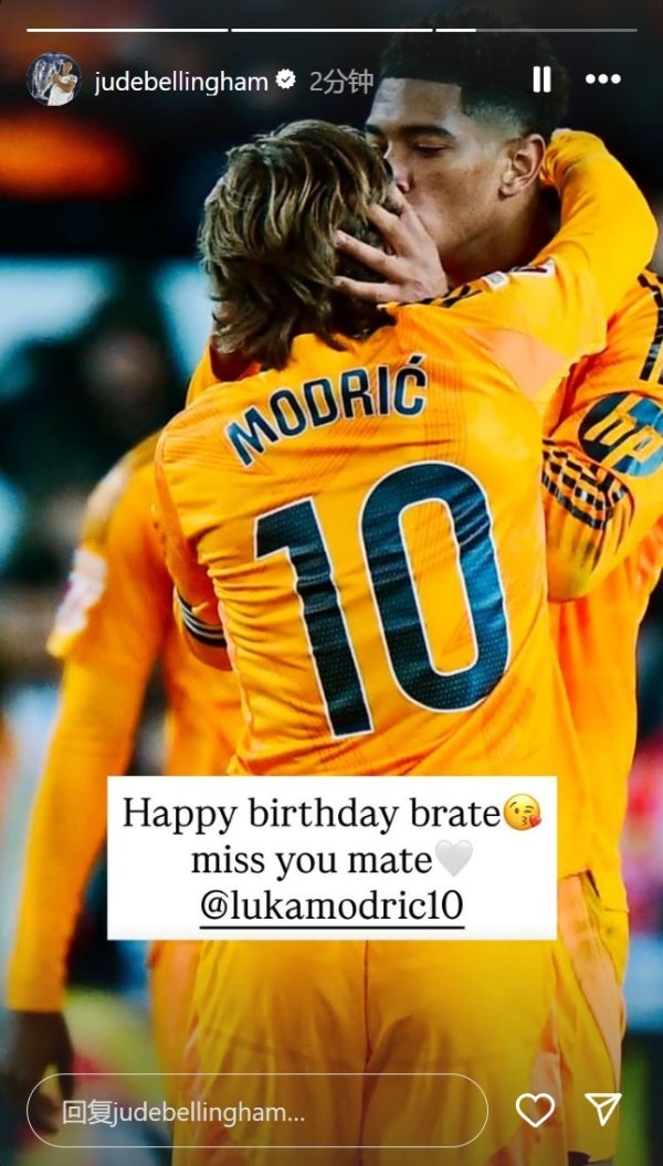 9月9日讯 今天莫德里奇迎来40岁寿辰,贝林厄姆在社媒晒照送道贺。 贝林厄姆写谈:“寿辰惬心,昆玉😘思你了,一又友🤍” 本年夏窗,莫德里奇离开皇马目田转会至AC米兰。......查看更多