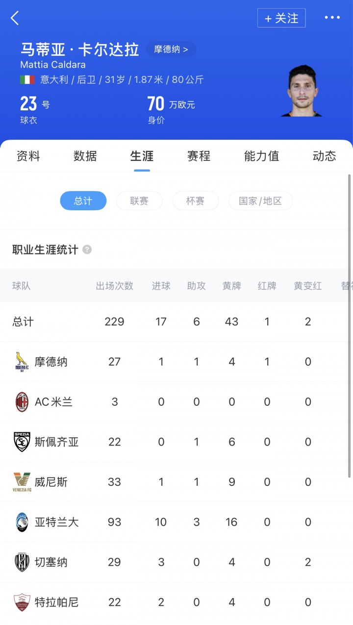 卡尔达拉出自亚特兰大青训,2018年以3500万欧元转会费加盟AC米兰,但他因为伤病只为红黑军团出场过3次。客岁夏天,卡尔达拉以解放球员身份加盟意乙摩德纳,上赛季他共为摩德纳出场27次。本年7月公约到期后,卡尔达拉莫得再为其他球队效劳。