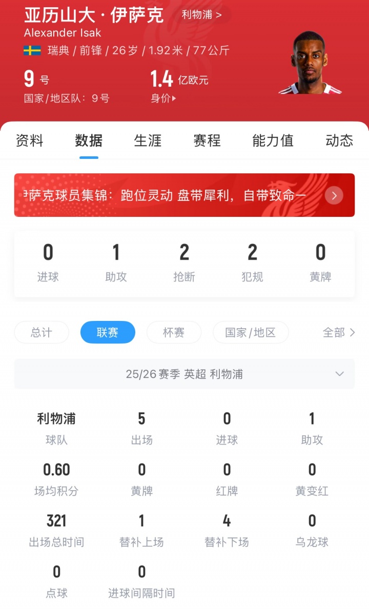 11月23日讯 英超第12轮,利物浦主场0-3不敌丛林,伊萨克首发出战68分钟被换下。