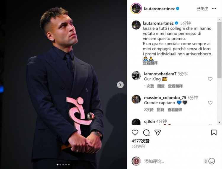 劳塔罗社媒晒出领奖的像片,并写谈:“感谢悉数投票援手我的球员,是你们让我赢得了这个奖项。”
