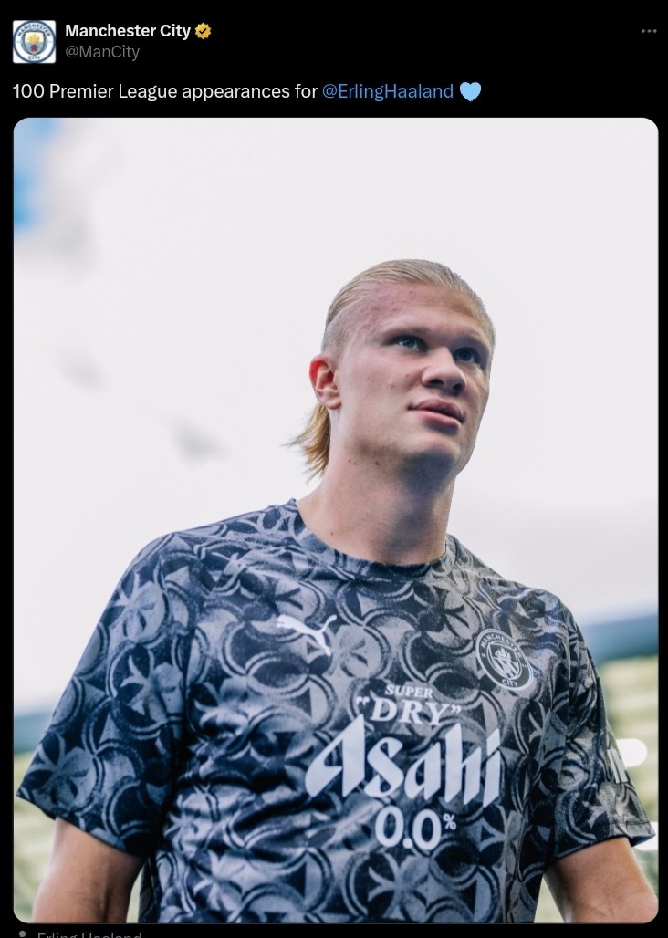 曼城官推晒照挂牵哈兰德百场英超里程碑,此前孝敬87球17助