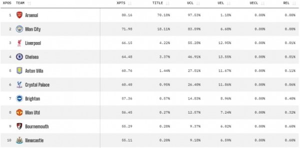 曼城本轮输纽卡!大数据探讨英超夺冠概率:阿森纳升至70.18%领跑
