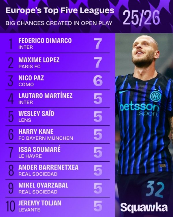 10月9日讯 Squawka统计了球员本赛季在五大联赛通顺战中创造首要契机的次数,并排出榜单,迪马尔科、洛佩斯7次居首,尼科-帕斯6按次三。 本赛季五大联赛通顺战创造首要契机排行: 迪马尔科(外洋米兰)—— 7 洛佩斯(巴黎FC)—— 7 尼科-帕斯(科莫)—— 6 劳塔罗(外洋米兰)—— 5 赛义德(朗斯)—— 5 凯恩(拜仁慕尼黑)—— 5 索玛尔(勒阿弗尔)—— 5 巴雷内切亚(皇家社会)—— 5 奥亚萨瓦尔(皇家社会)—— 5 托利安(莱万特)—— 5......查看更多