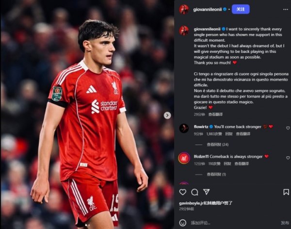 09月25日讯 据名记罗马诺报谈,利物浦18岁中卫莱奥尼十字韧带扯破,将缺阵数月,争取赛季末复出,莱奥尼刚刚更新社媒。 莱奥尼:我念念古道地感谢每一个在这个艰辛技巧向我抒发维持的东谈主。这不是我一直期待的首秀,但我会任重道远,尽快回到这座神奇的球场踢球。十分感谢你们!❤️......查看更多