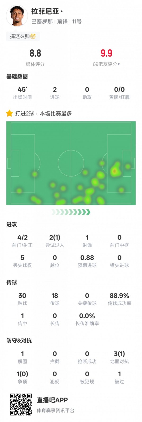 拉菲尼亚本场比赛数据:2射正2进球1过东谈主生效,评分8.8