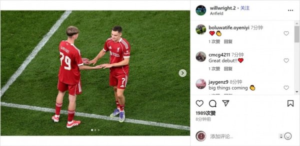 改日可期!利物浦17岁新援赖特社媒晒热身赛替补出场相片