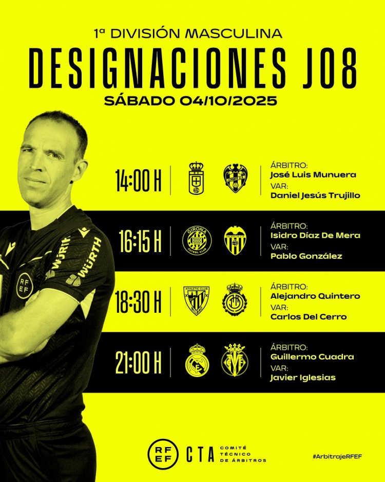 10月3日讯 西甲官方公布了10月4日比赛的裁判安排,夸德拉国法皇马vs比利亚雷亚尔。