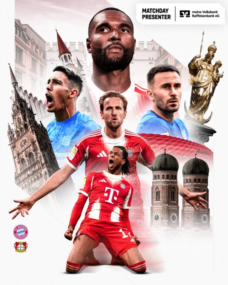 拜仁官方社媒发布了赛前海报,凯恩、奥利塞、若纳坦-塔出镜。配文:“咱们的城市,咱们的球迷,咱们的球场。咱们期待今晚主场对阵勒沃库森的比赛。”
