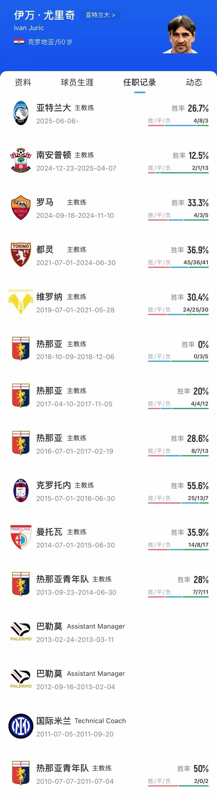 一年下课三次!官方:亚特兰大主帅尤里奇下课,球队意甲7轮不堪