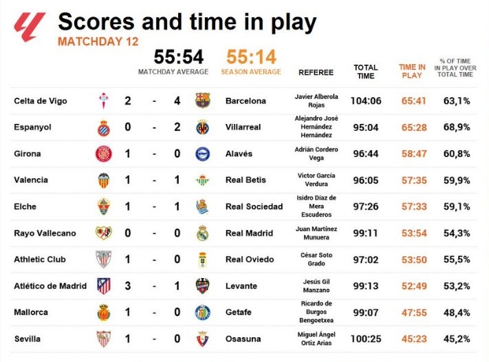 其中巴萨vs塞尔塔比赛灵验技艺65分41秒为最长,比利亚雷亚尔vs西班经纪东说念主灵验技艺占总比赛技艺68.9%,占比最高。此外皇马0-0战平巴列卡诺的比赛灵验技艺为53分54秒。
