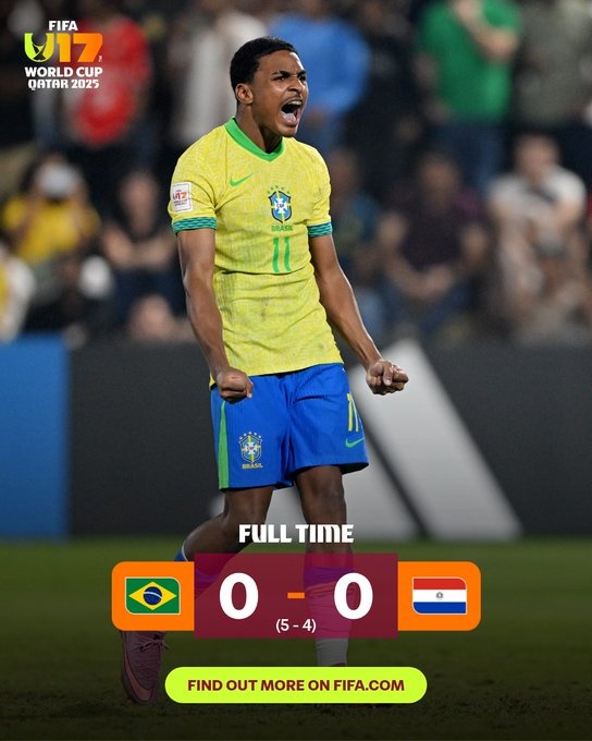 11月15日讯 U17天下杯1/16决赛,巴西和巴拉圭交手,最终巴西通过点球大战到手晋级。