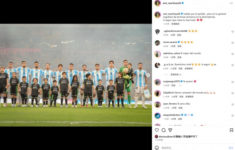 本场比赛门将马丁内斯首发出战,赛后他在个东谈主社媒晒出全队合照,配文写谈:“这场比赛让东谈主颓靡,但所以第一的收货完成预选赛令东谈主粗莽,让咱们不竭前进,好戏就要演出了。”