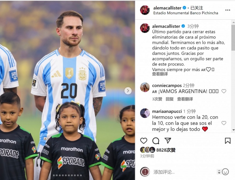 阿根廷中场麦卡利斯特在应付媒体上写说念:“终末一场比赛为本次全国杯预选赛画上句号。咱们以榜首位置收官,在共同迈出的每一步中倾尽全力。感谢你们的随同,能参与其中是我的走时。咱们历久追求更多。”