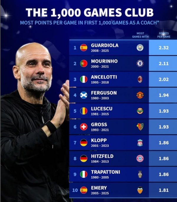 11月10日讯 曼城在本轮英超焦点战3-0完告捷物浦,瓜迪奥拉也就此解锁抓教1000场里程碑。《转会阛阓》统计清楚他亦然场均拿分最高的千场教头。 德转列千场教头场均拿分榜:(及遣散千场周期) 1.瓜迪奥拉(2008-2025),2.32分 2.穆里尼奥(2000-2021),2.11分 3.安切洛蒂(1995-2018),2.02分 4.弗格森(1980-2003),1.94分 5.卢塞斯库 (1981-2015),1.93分 6.克里斯蒂安·格罗斯 (1993-2021),......查看更多