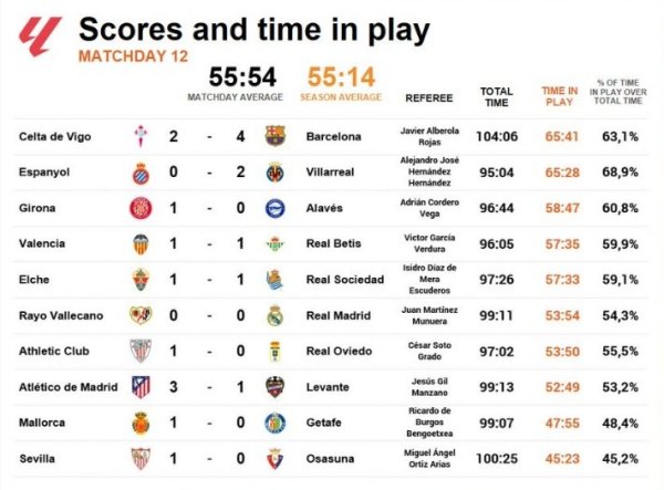 11月10日讯 数据网站OPTA清点了本轮西甲灵验技艺榜单,其中巴萨4-2塞尔塔以及比利亚雷亚尔2-0西班经纪东说念主的两场比赛灵验技艺零散65分钟。 其中巴萨vs塞尔塔比赛灵验技艺65分41秒为最长,比利亚雷亚尔vs西班经纪东说念主灵验技艺占总比赛技艺68.9%,占比最高。此外皇马0-0战平巴列卡诺的比赛灵验技艺为53分54秒。......查看更多