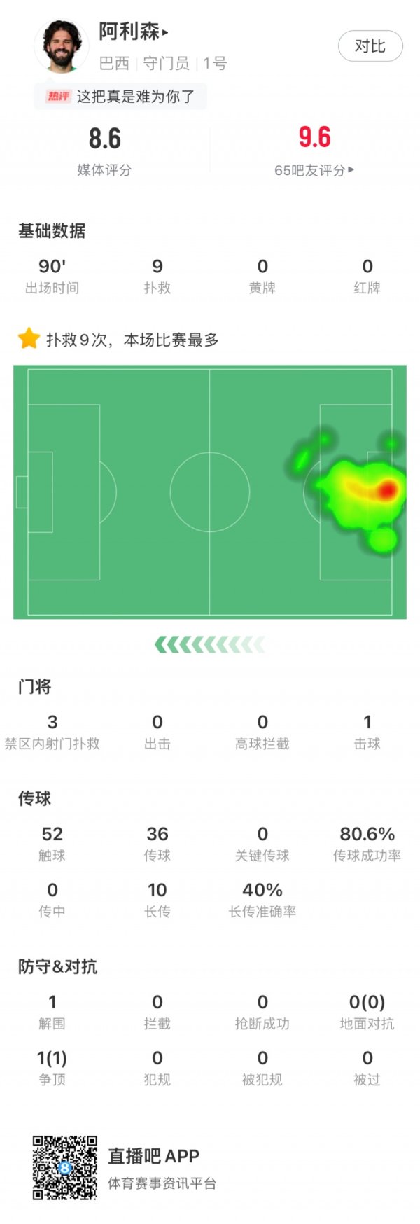 森爹!阿利森单场9次扑救,独一没扑出去的是玻利维亚的点射