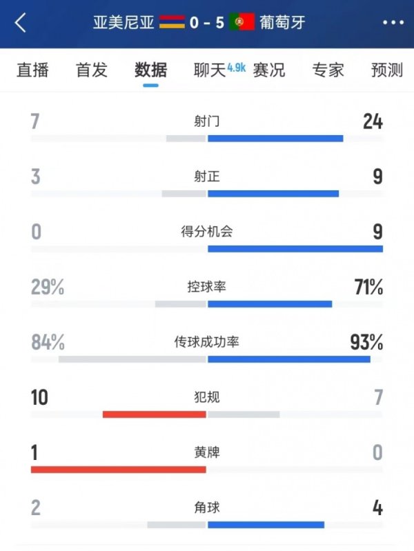 葡萄牙全场数据:控球率71%,射门24-7、射正9-3、得分契机9-0