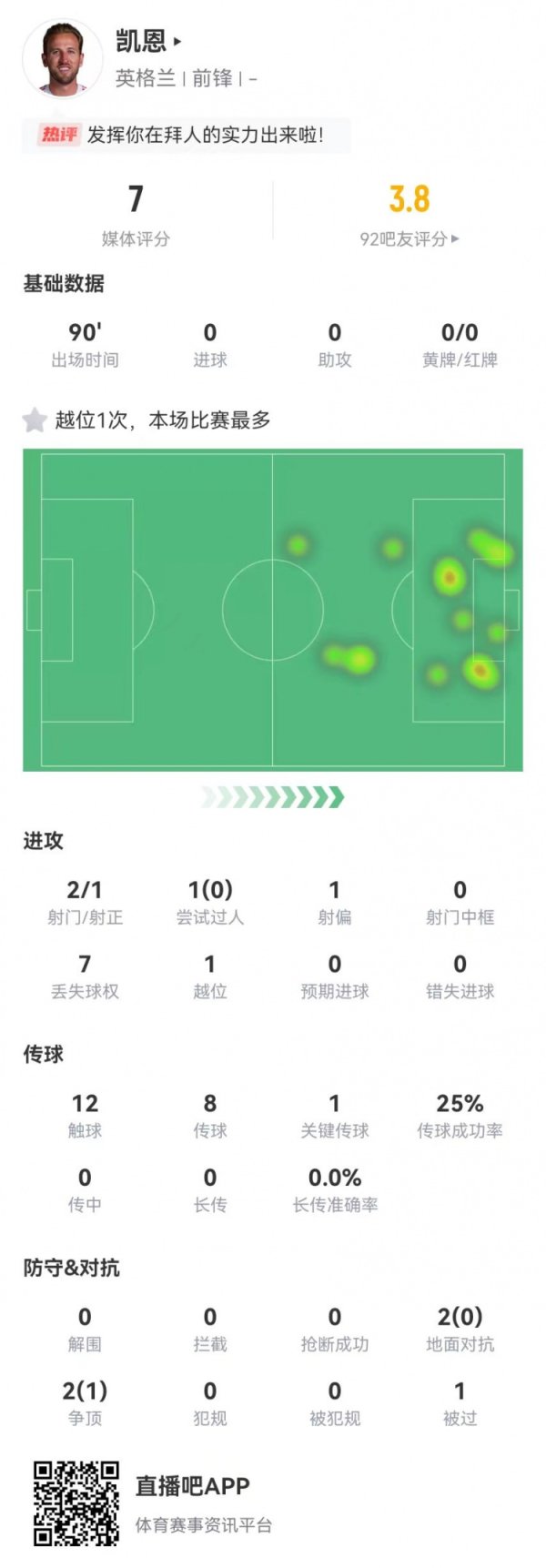 凯恩本场2射1正 1关键传球1造良机 4叛逆1收效 获评7.0分
