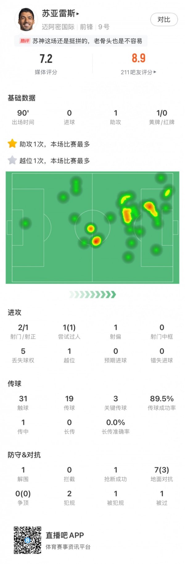 苏亚雷斯全场数据:3次重要传球、1次助攻、5次失球权,获评7.2分