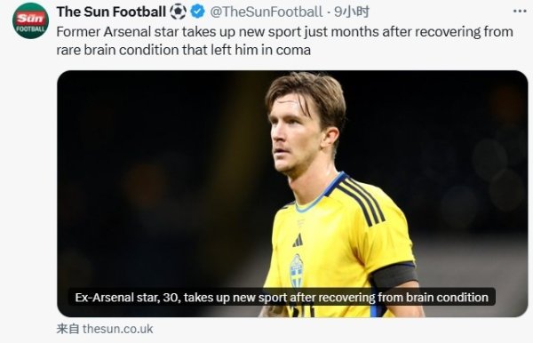 太阳报:前阿森纳球员奥尔森脑血栓养息后将和队友打拳击友谊赛