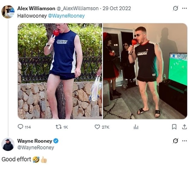 自称鲁尼超等粉丝的亚历克斯-威廉姆森,在2022年万圣节穿上了险些一模同样的服装,而此举成效引起了鲁尼本东说念主的提神。鲁尼在威廉姆森发布在相片下方挑剔说念:“历害。”