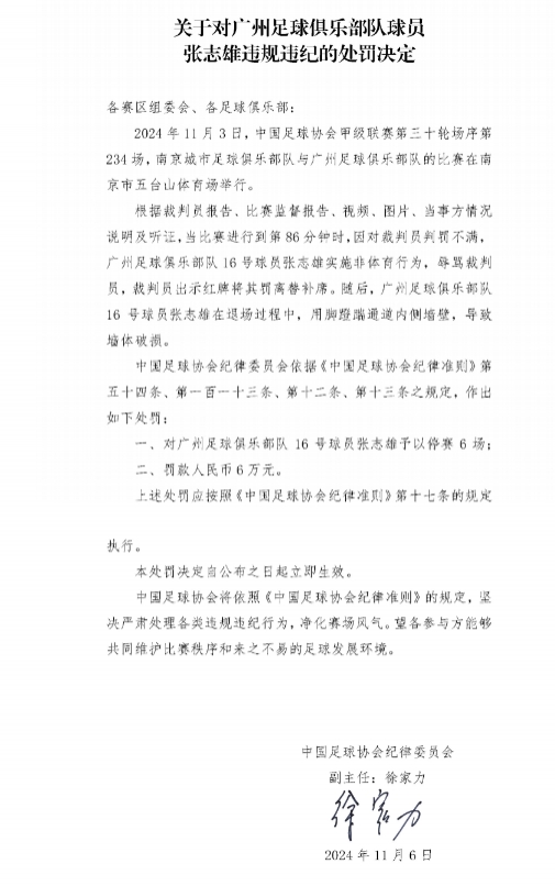 而在这个赛季的收官战中,张志雄再次引起事端。由于对判罚起火,张志雄作念出瑕瑜裁判的活动,并在退场流程中蹬踹通说念墙体,过后被中国足协贬责停赛6场并罚金6万元东说念主民币。