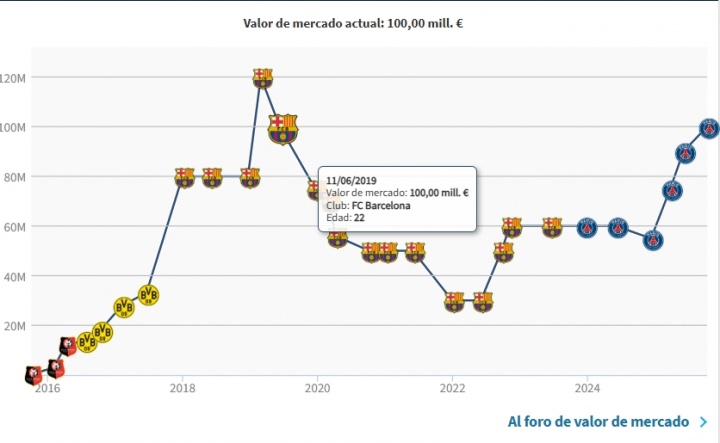 登贝莱身价最低时唯有3000万欧,前次身价达到1亿欧元,还要追忆到2019年着力于巴萨时分。