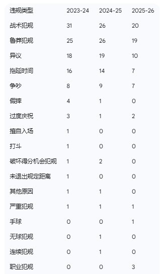 在2023-24比联赛季,切尔西因策略违例吃到31张牌,虽然此后逐年下降,但截至2025-26比联赛季,该项统计仍以20张牌位居首位。鲁莽违例的频率同样维持较高水平,前两个比联赛季分别录得25张和26张,本比联赛季目前为19张。