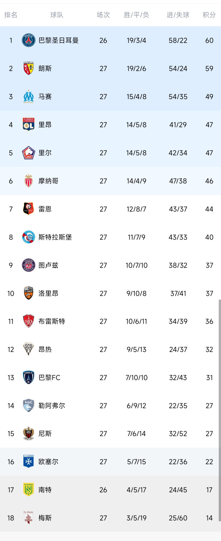 西甲巴塞罗那遭皇马紧追。法甲圣日尔曼遭朗斯紧追。