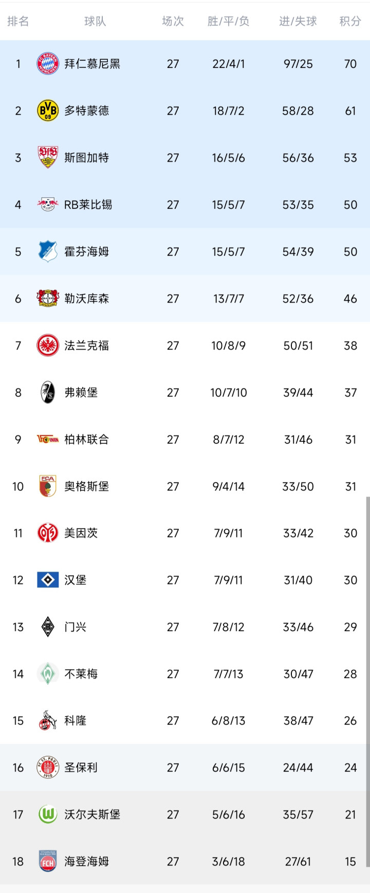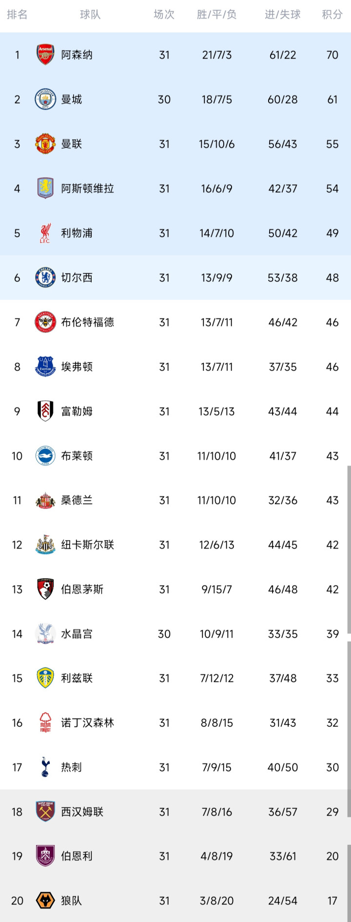 英超阿森纳、德甲拜仁,超第2名约10分,领跑 较多。