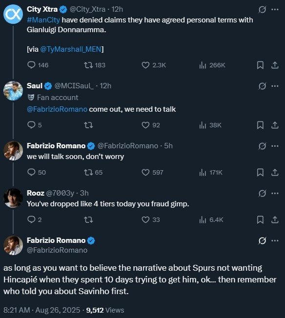 多纳鲁马往复有变? 被曼城球迷喷是骗子, 罗马诺复兴: 爱信不信