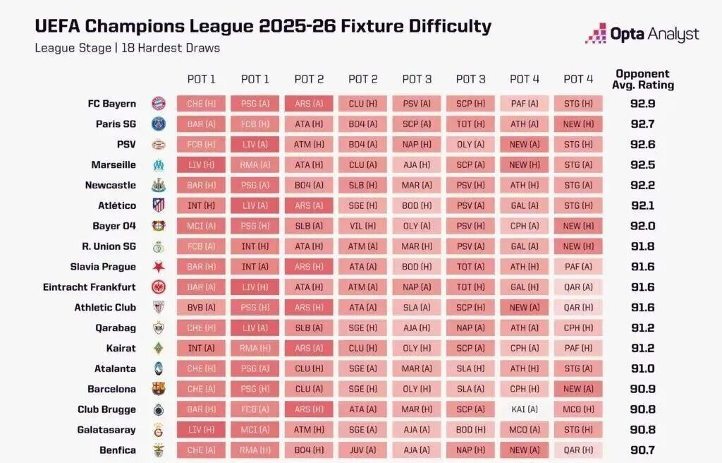 从举座看,巴萨的抽签后果相对理思,他们一档抽到大巴黎,二档抽中法兰克福和布鲁日,三档抽到奥林匹亚科斯和布拉格斯拉维亚,四档抽中哥本哈根和纽卡斯尔,比拟其他权门,巴萨的赛程压力赫然较小。阿森纳的签运也迥殊可以,消亡了多数最强敌手,有望在联赛阶段积聚填塞积分告成晋级16强。相背,国米、切尔西和马竞的赛程难度较大,需要濒临多个劲敌,尤其是看到马竞这个赛程啊,我都替他持把汗,但就这竟然还不是opta难度名次榜前三?
