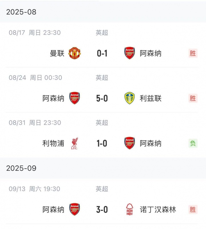 阿森纳赛季前四轮战绩↓