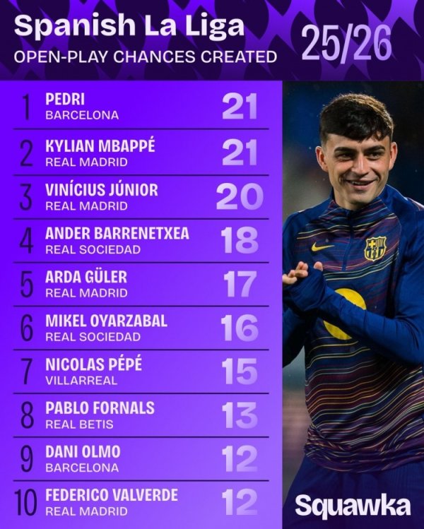 西甲本赛季通顺战创造契机榜:佩德里、姆巴佩21次比肩第一