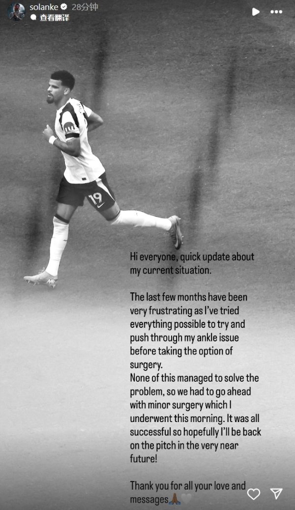 10月2日讯 热刺时尚索兰克更新社媒,他谈到了我方的伤情收复情况。 索兰克:“公共好,给公共快速更新一下我现在的情况。往常的几个月特别令东说念主怨恨,因为我尝试了整个可能的意见来处治我的脚踝问题,但齐莫得告捷,是以今天早上我不得不接纳了小手术。手术很告捷,但愿很快就能回到球场上!感谢公共的矜恤和守旧。” 热刺主帅弗兰克此前谈到了索兰克的伤情:“咱们知说念索兰克的脚踝问题还是困扰他有一段时期了,他决定作念个小手术。”......查看更多
