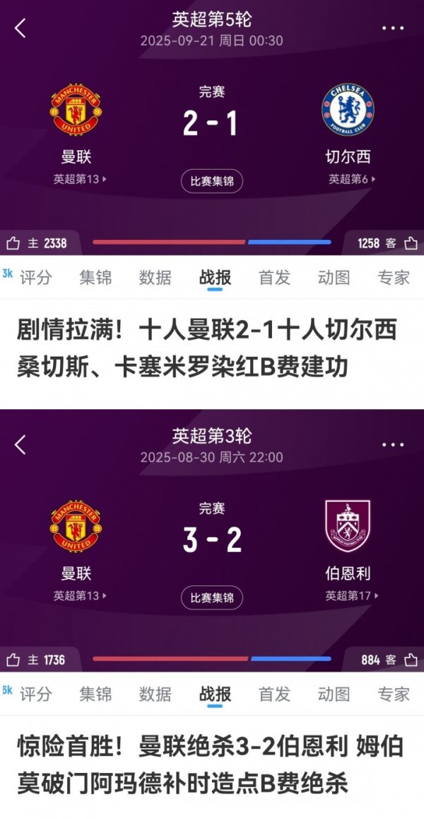 曼联赢球场次: 97分钟绝杀3-2伯恩利, 2-1十东谈主切尔西