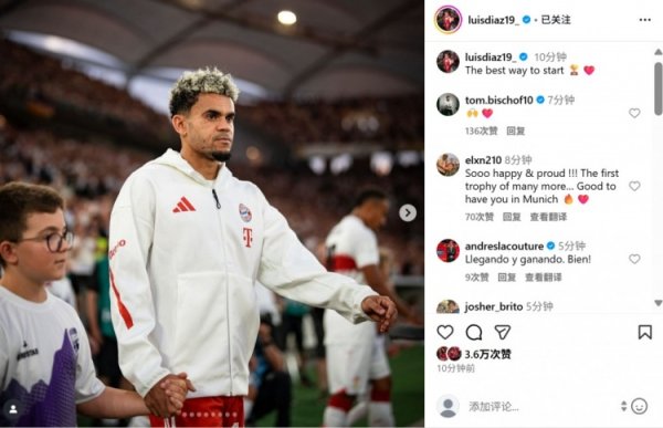 8月17日讯 在德国超等杯决赛,拜仁2-1打败斯图加特夺冠。 本场比赛新援路易斯-迪亚斯破门,打进拜仁活命首球,他也在个东谈主社媒晒出本场入场时像片,配文写谈:“以最佳的款式开启新赛季🏆❤️”......查看更多