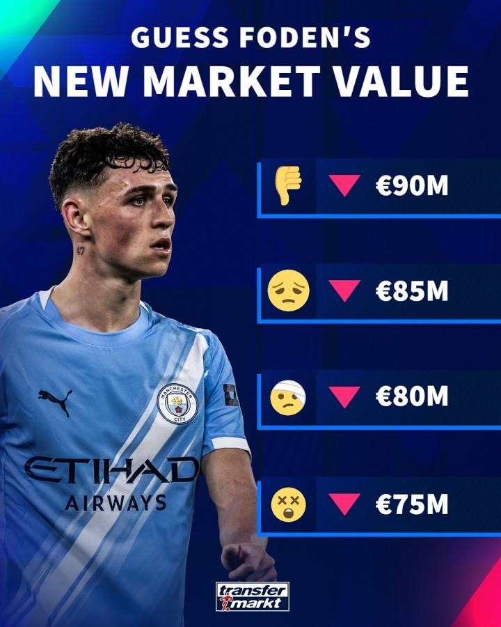 10月16日讯 明日德转将更新英超球员身价,德转官方社媒当天发图预热福登身价变化,球员身价必定着落,最多跌至7500万。