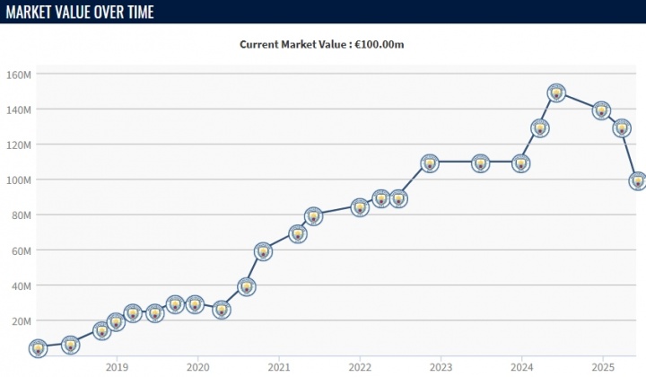 值得一提的是,这将是福登络续四次德回身价更新后身价着落,在2024年,福登身价曾一度达到巅峰的1.5亿欧元,但最近几次身价更新,福登现在身价如故为1亿欧元,这也意味着足坛德回身价上亿球员又要减少一位。