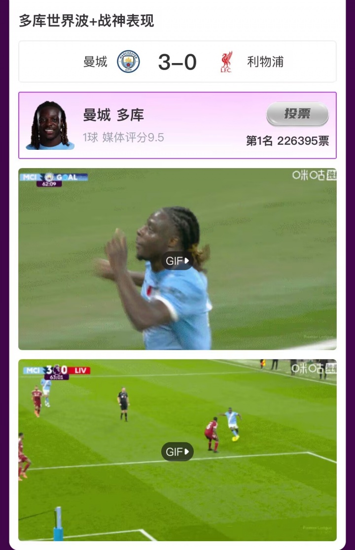 在曼城3-0打败利物浦的焦点大战中,多库不仅孝敬精彩寰宇波破门,还有1次造点、3次要道传球,7次见效+11次造反见效全场最高,赢得吧友超22万的投票,当选【X咪咕体育英超第11轮最好球员】!