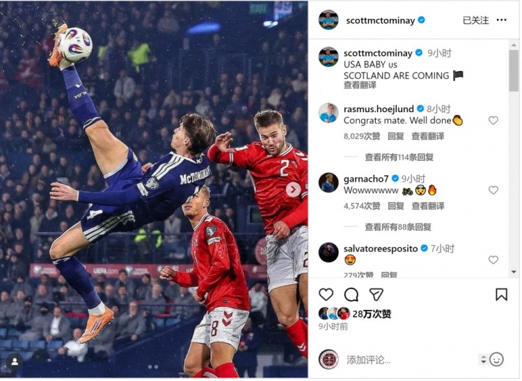 麦克托米奈社媒庆祝球队插足全国杯,配文:“好意思国宝贝,苏格兰来了!”
