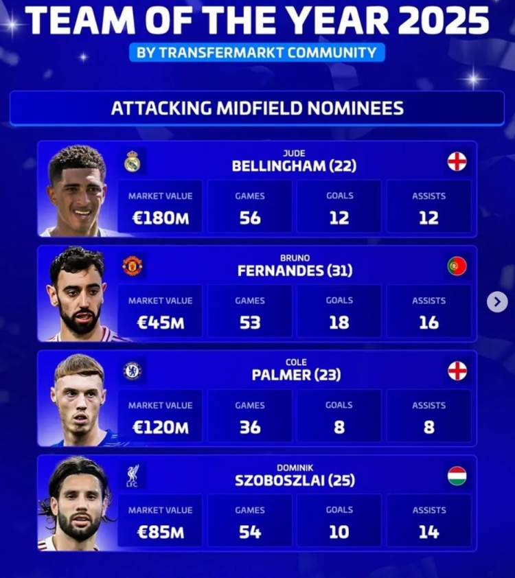 德转评连年度最好前腰名单:贝林厄姆、B费、帕尔默、索博斯洛伊