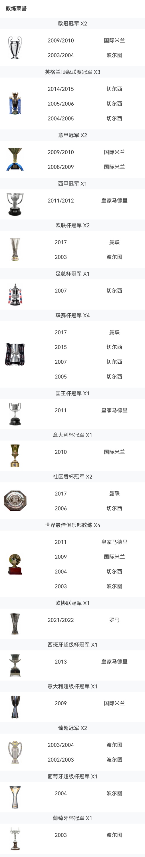 62岁的穆里尼奥最近一次率队夺冠如故21/22赛季在罗马拿到的欧协联冠军。再往前记忆,便是曼联时辰16/17赛季拿到的“小三冠”。