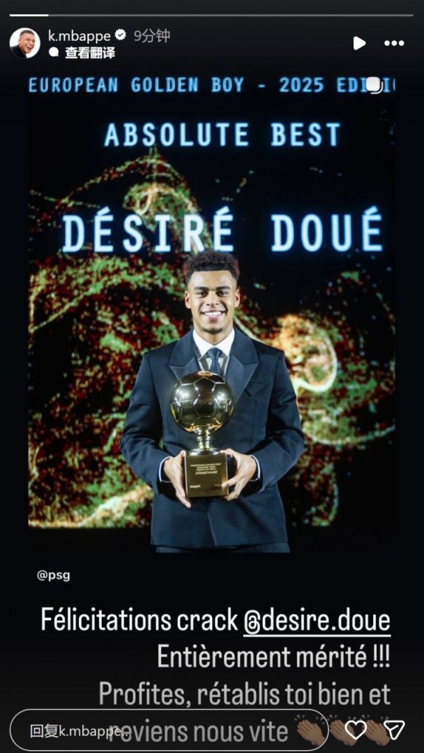 姆巴佩社媒祈福杜埃获取金童奖:实至名归,早日康复!